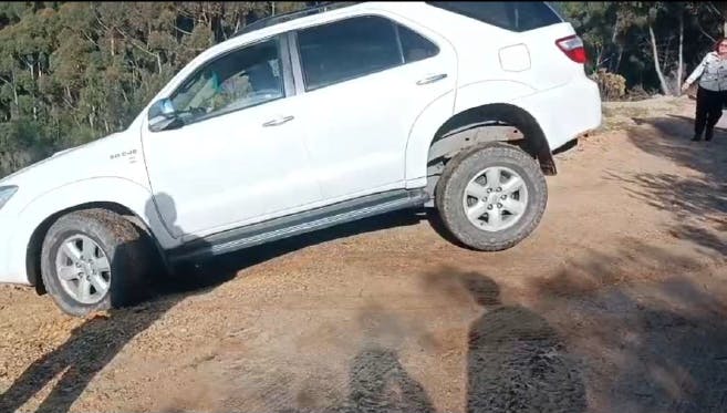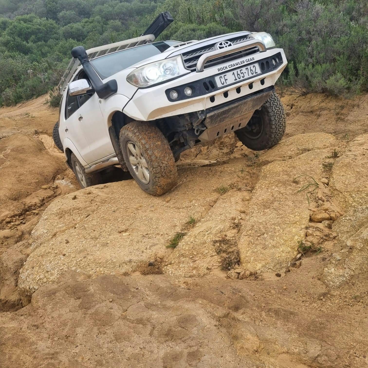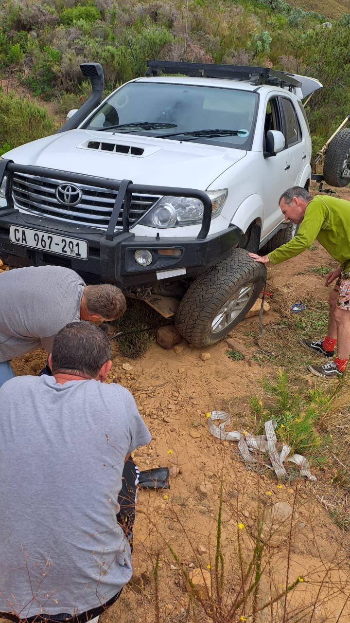 The next obstacle we arrived upon looked easy enough so after some assessment Chad took the lead and got his Ford stuck. His rear bumper got caught on the rocks leaving his car in a situation which took a team effort of trying different recovery ideas to get him out. Russel tried to pull him out and this did not work so Lindsay stepped in with his Toyota Fortuner and pulled him out and he took the bypass. Colin and Lindsay both took on the challenge and succeeded in getting through.
